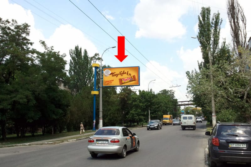 Зовнішня реклама в Херсоні: рекламний щит 3×6 м. Поруч орієнтир: супермаркету Оскар (флажок). Сторона B, розмір 3×6 м. Рекламне розміщення з високою видимістю та охопленням. Код: Khe1005.