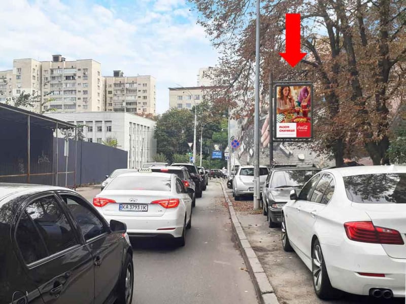 Рекламна площина в Києві — сітілайт. Напрямок руху — вул. Московської. Сторона A. Ідеальне місце для розміщення реклами вашого бренду. Код: Ki9392.