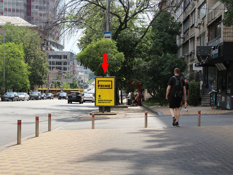 Зовнішня реклама в Києві: сітілайт. Площина орієнтована в сторону вул. Жилянської. Сторона A. Рекламне розміщення з високою видимістю та охопленням. Код: Ki9979.