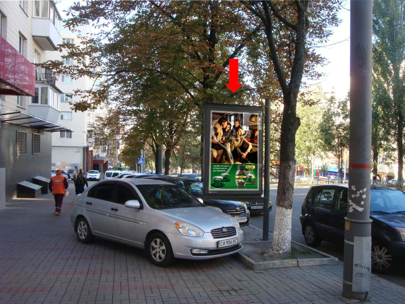 Зовнішня реклама в Києві: сітілайт 1.8×1.2 м. Площина орієнтована в сторону вул. Хрещатик. Формат 1.8×1.2 м (сторона B). Стратегічна локація для ефективної зовнішньої реклами. Код: 7085b.