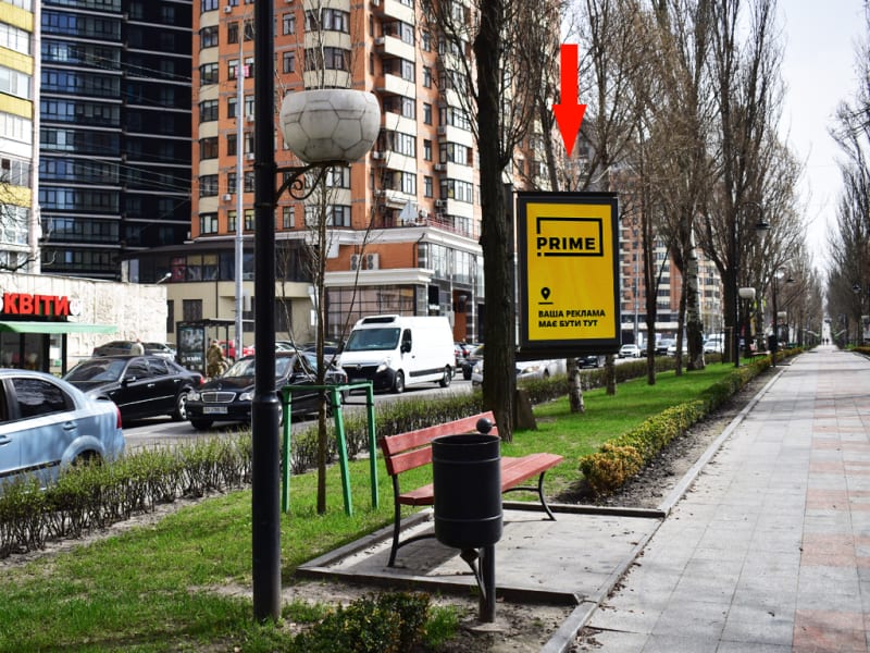 Зовнішня реклама в Києві: сітілайт 1.8×1.2 м. Площина орієнтована в сторону пл. Л. Українки. Формат 1.8×1.2 м (сторона B). Стратегічна локація для ефективної зовнішньої реклами. Код: Ki0153.