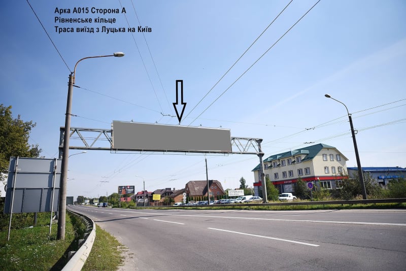 Зовнішня реклама в Луцьку: рекламна конструкція 3×15 м. Конструкція розташована на виїзді з міста. Формат 3×15 м (сторона A). Рекламне розміщення з високою видимістю та охопленням. Код: А015.