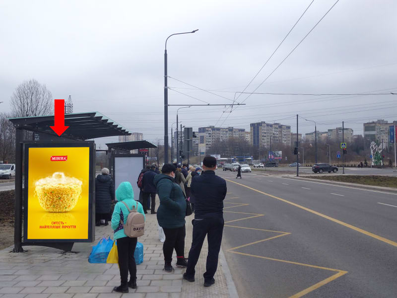 Пропонуємо в оренду сітілайт 1.8×1.2 м в м. Львів. Площина орієнтована в сторону пр. Червона Калина. Розмір площини: 1.8×1.2 м, сторона B. Підходить для іміджевої та навігаційної реклами. Код: Lv1895.