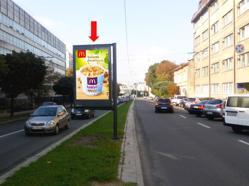 Сітілайт 1.8×1.2 м для розміщення зовнішньої реклами в Львові. Площина орієнтована в сторону Бандери вул.. Розмір площини: 1.8×1.2 м, сторона A. Стратегічна локація для ефективної зовнішньої реклами. Код: Lv1807.