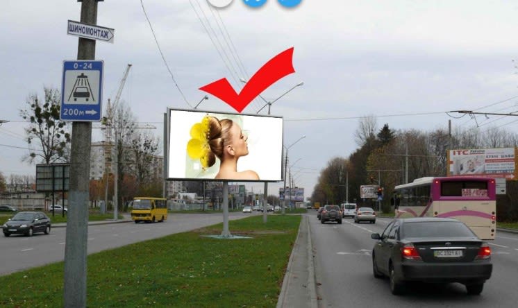Зовнішня реклама в Львові: рекламна конструкція 3×6 м. Розмір площини: 3×6 м, сторона A. Чудова видимість — оптимальний варіант для просування бренду. Код: Б94а.