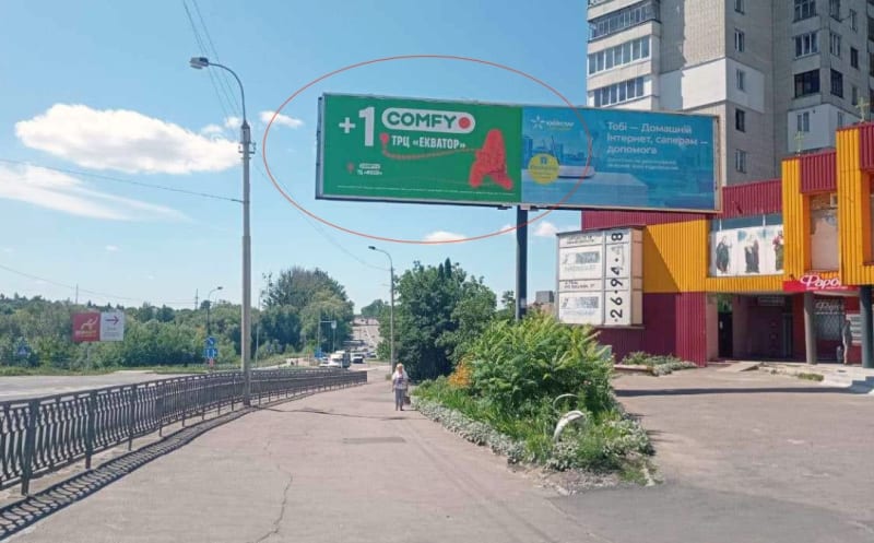 Зовнішня реклама в Рівному: рекламна конструкція 3×6 м. Розмір площини: 3×6 м, сторона A. Зручне розташування для максимального охоплення аудиторії. Код: Rv031.