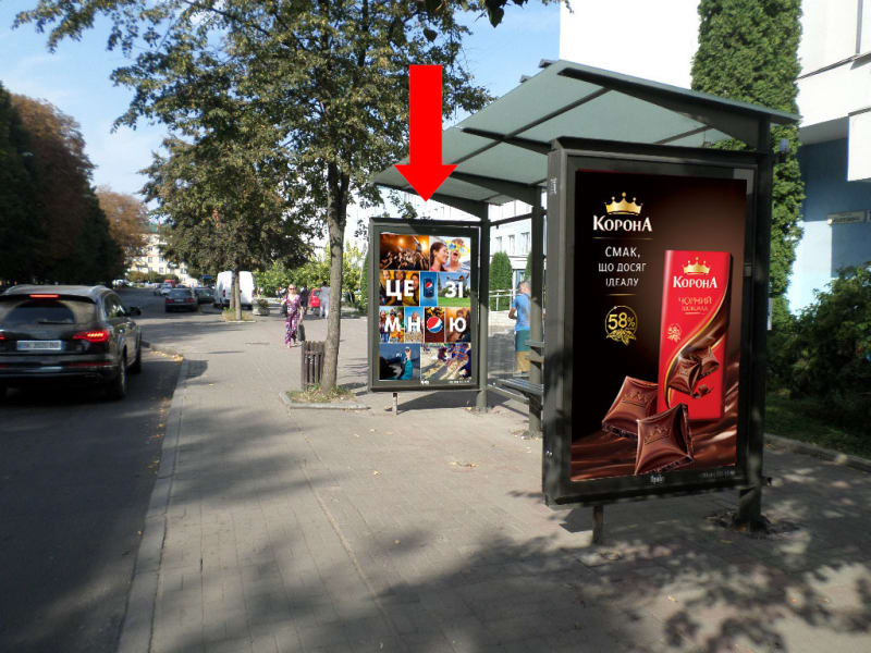 Сітілайт 1.8×1.2 м для розміщення зовнішньої реклами в Рівному. Поруч орієнтир: кінотеатру Україна. Формат 1.8×1.2 м (сторона A). Високий трафік — ефективне розміщення для будь-якого бізнесу. Код: Rvn1129.