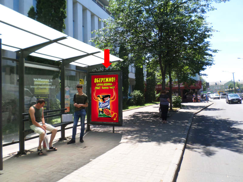 Зовнішня реклама в Рівному: сітілайт 1.8×1.2 м. Поруч орієнтир: кінотеатру Україна. Розмір площини: 1.8×1.2 м, сторона B. Рекламне розміщення з високою видимістю та охопленням. Код: Rvn1132.