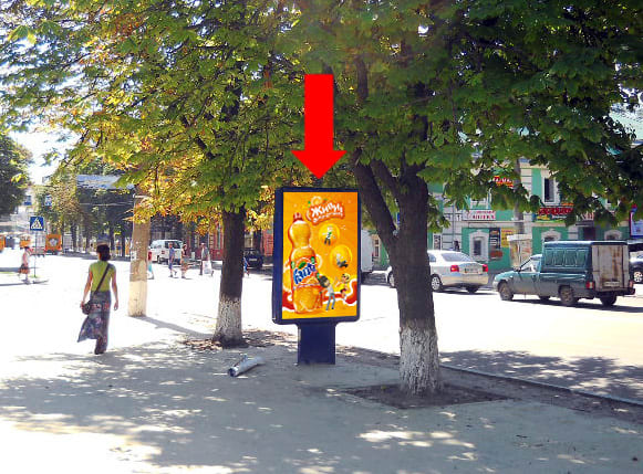 Зовнішня реклама в Сумах: сітілайт 1.8×1.2 м. Розмір площини: 1.8×1.2 м, сторона B. Забезпечує широке охоплення цільової аудиторії в Сумах. Код: Sum1021.