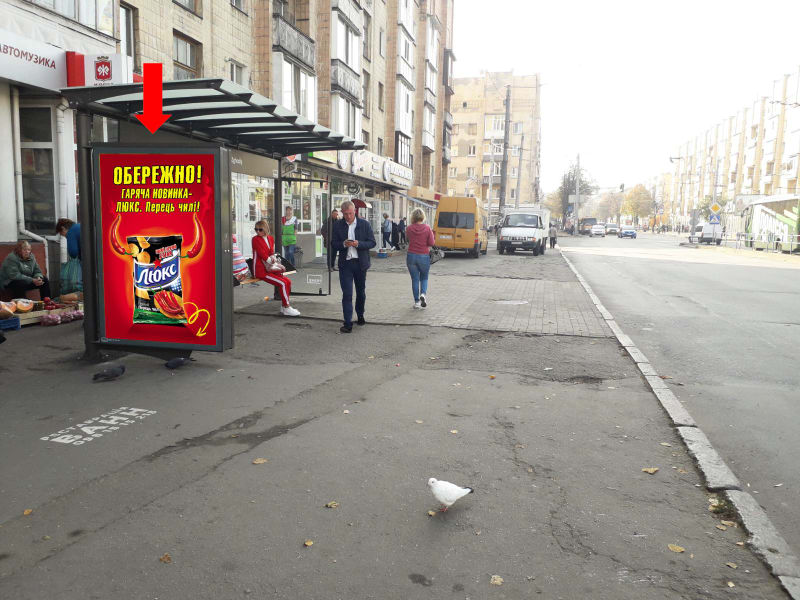 Зовнішня реклама в Житомирі: сітілайт 1.8×1.2 м. Формат 1.8×1.2 м (сторона B). Стратегічна локація для ефективної зовнішньої реклами. Код: Zht1549.